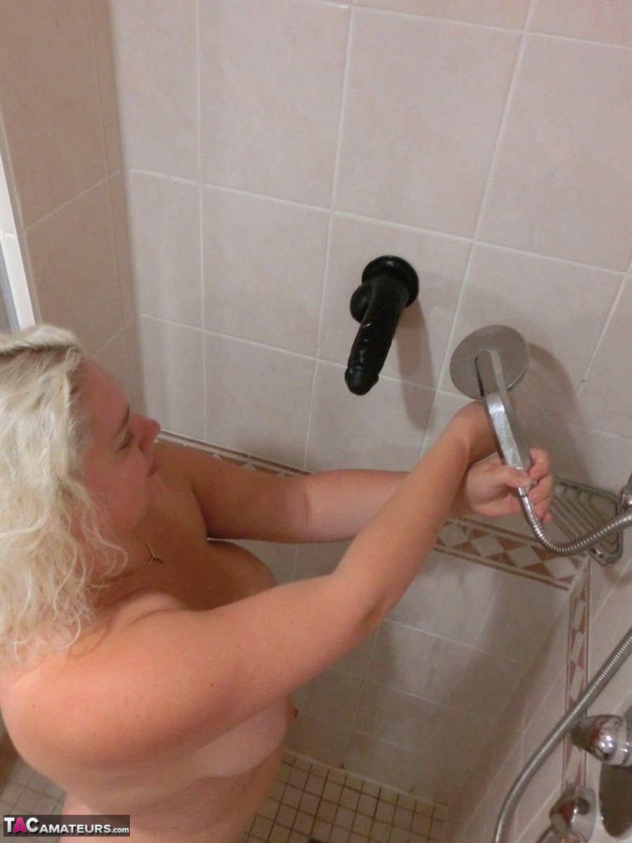 This blonde slut's photo session heats up with a dildo fuck before she gets down to business, jerking and sucking off her photographer until he decorates her 34DD tits with a hot load of cum, leaving her grinning with satisfaction.