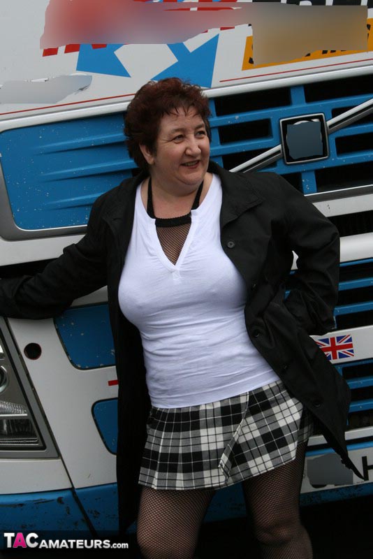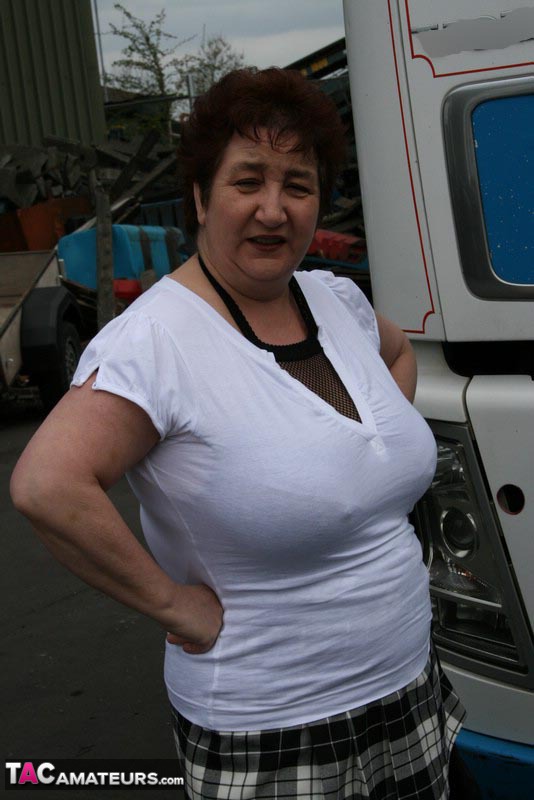 KinkiCarol, the trucker MILF with short hair and big tits, is here to grab your attention. Once she does, she'll invite you into her truck to show off her black sheer lingerie, revealing her massive tits and ass, ready for a truck cabin fuck.